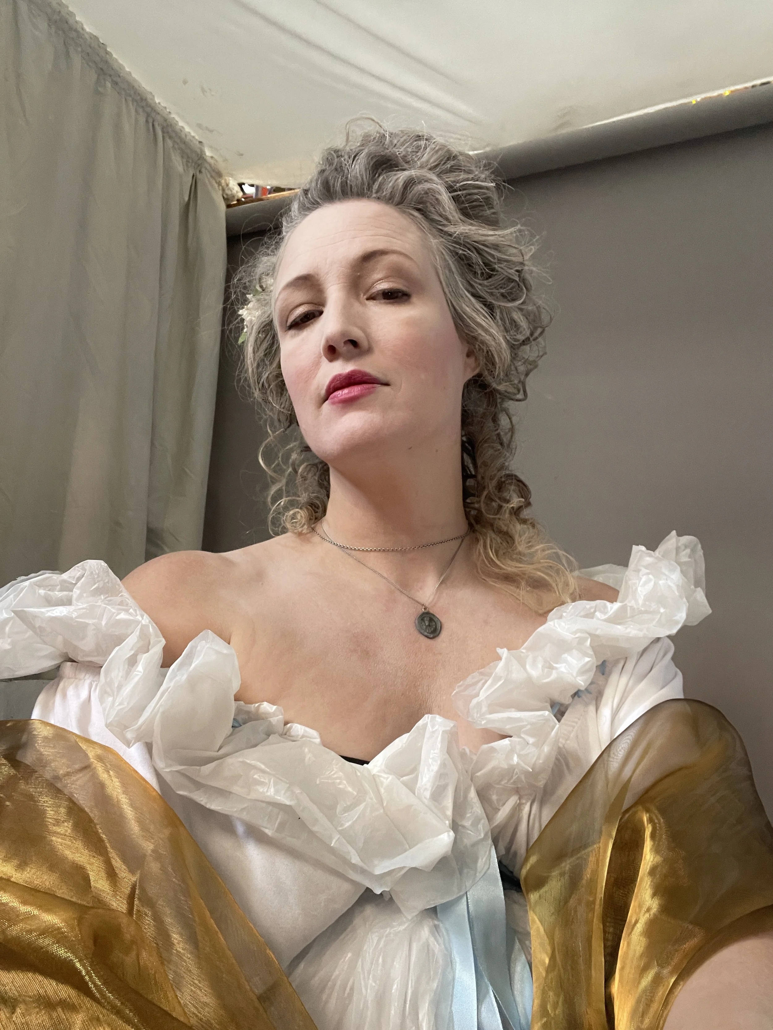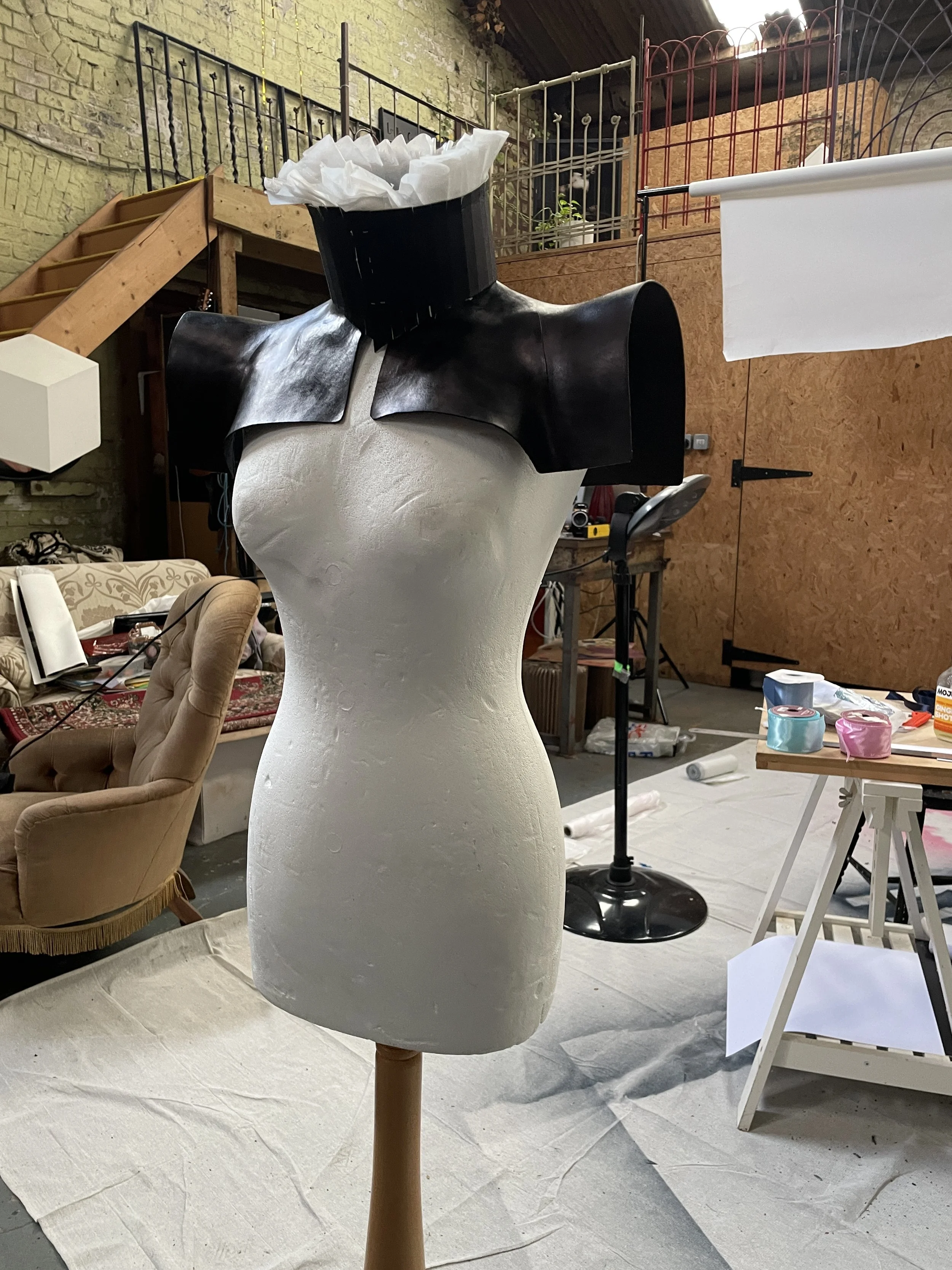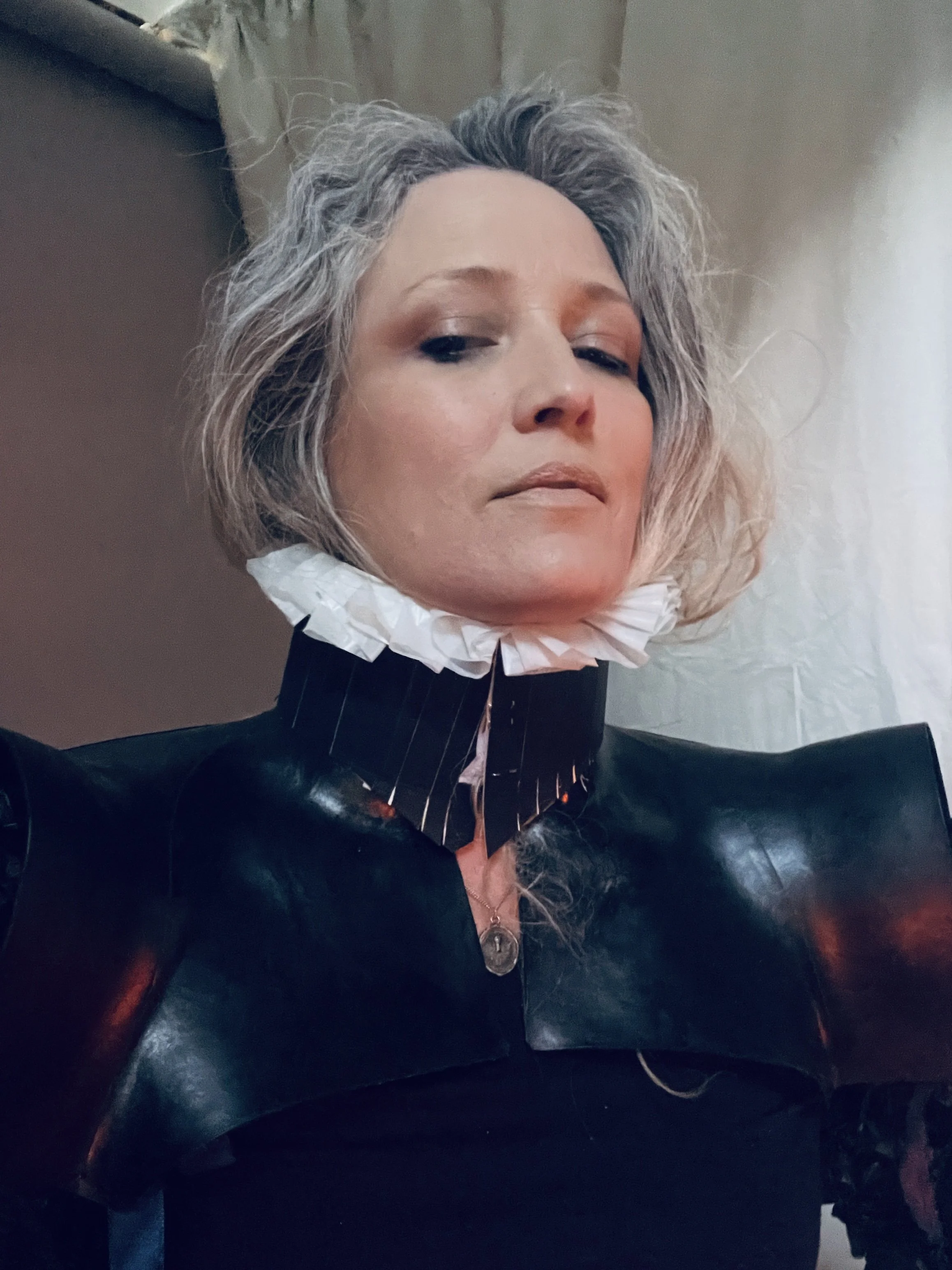 The costumes are all made by me out of one thing or another, often plastic sheeting or paper. I’ve also incorporated a custom leather shoulderpiece by extraordinary leatheress Rachel Freire.
