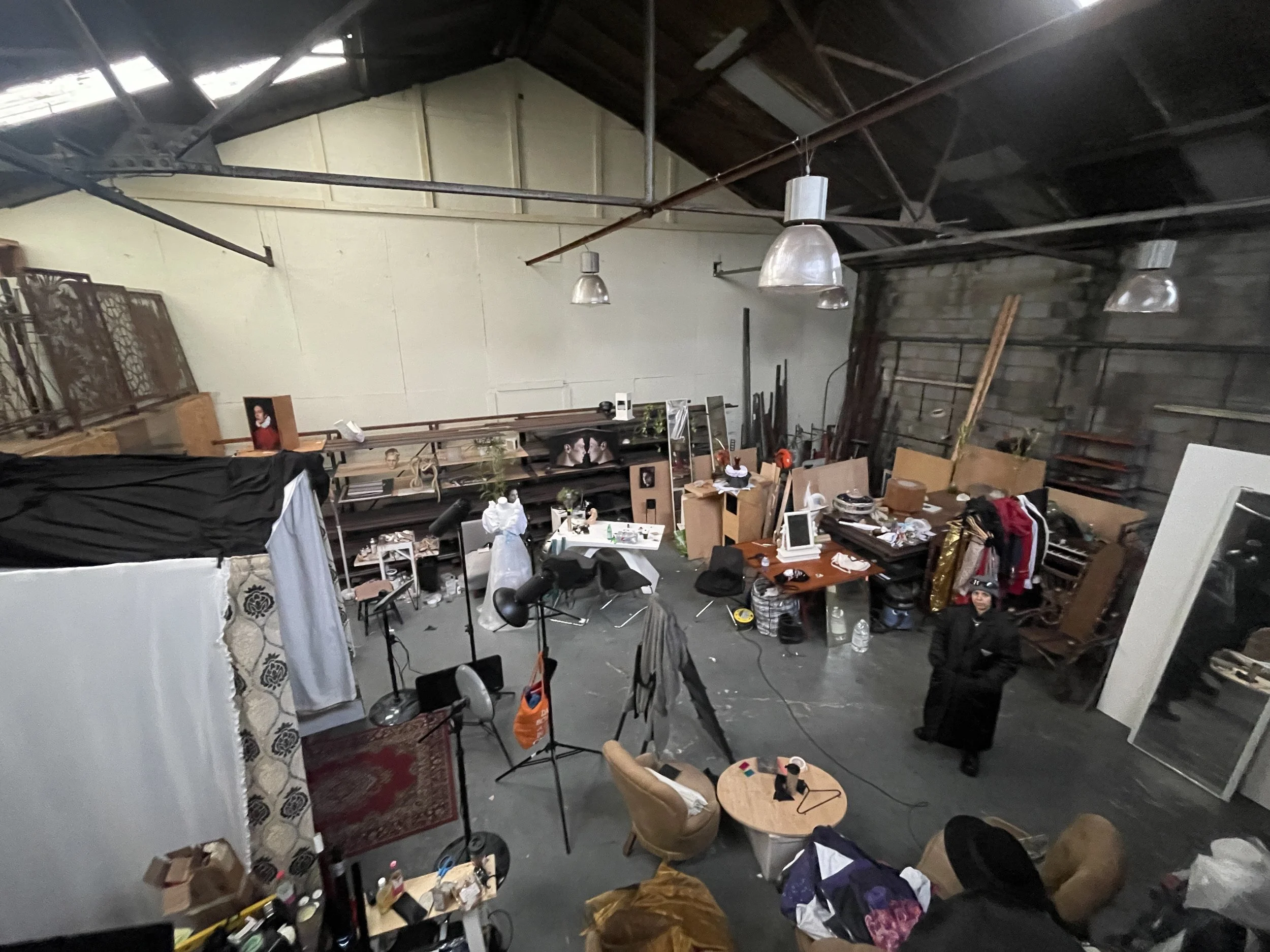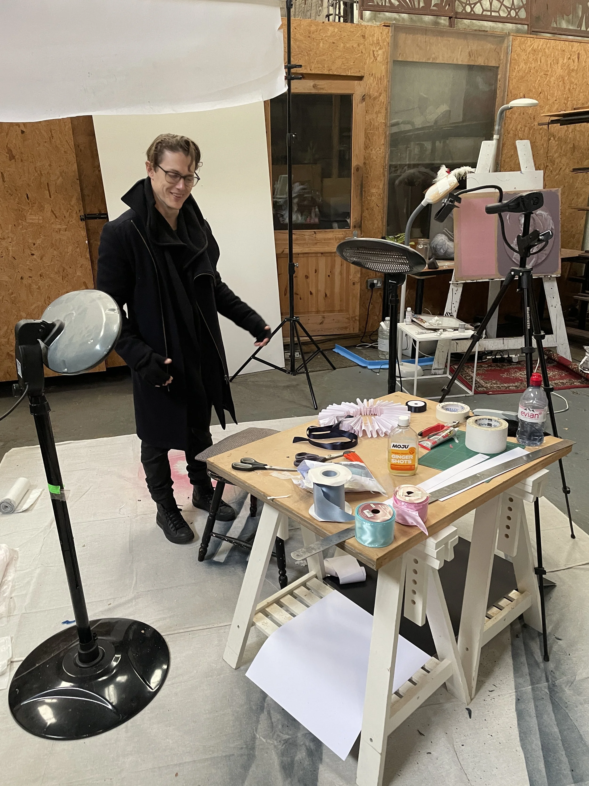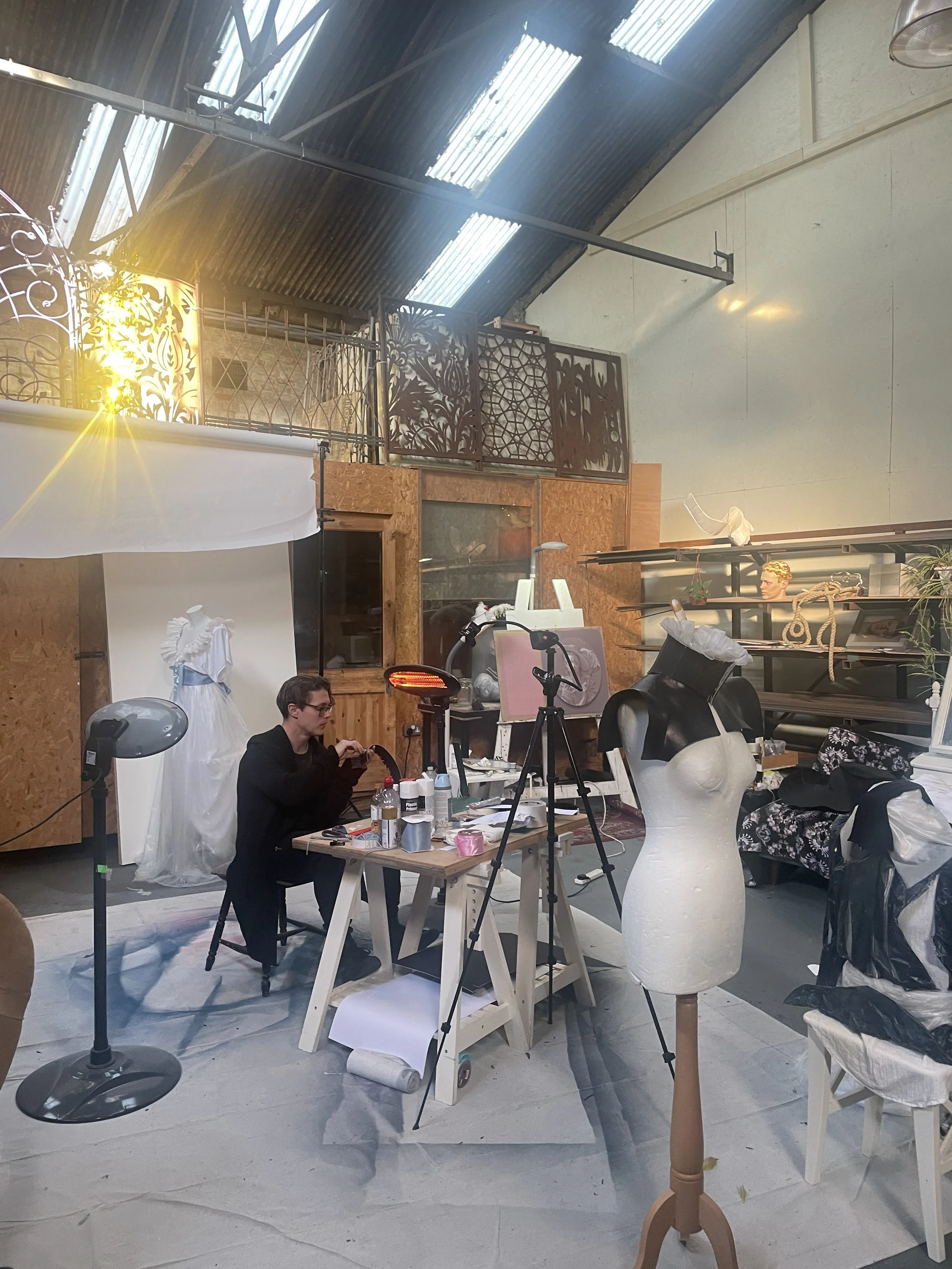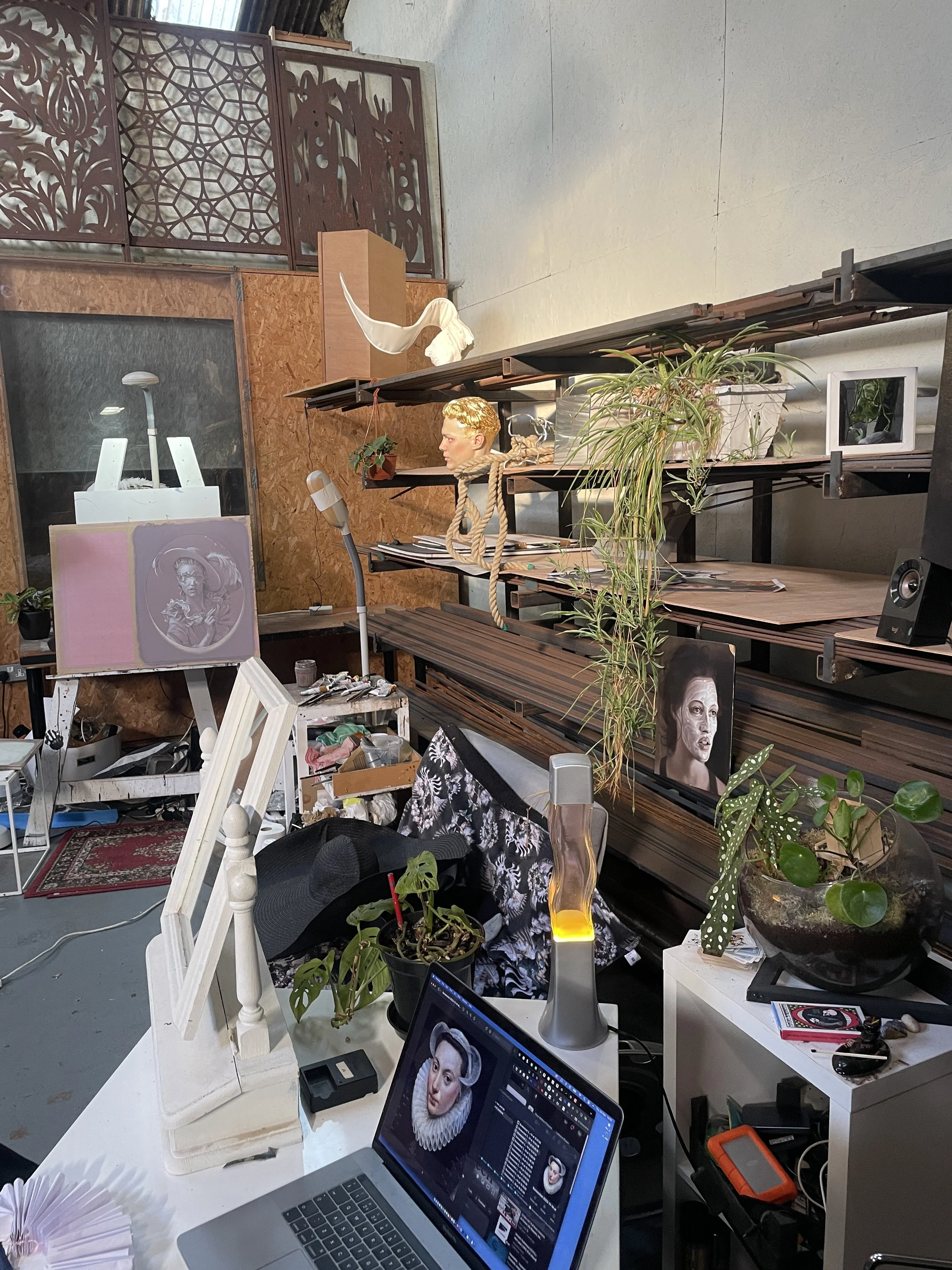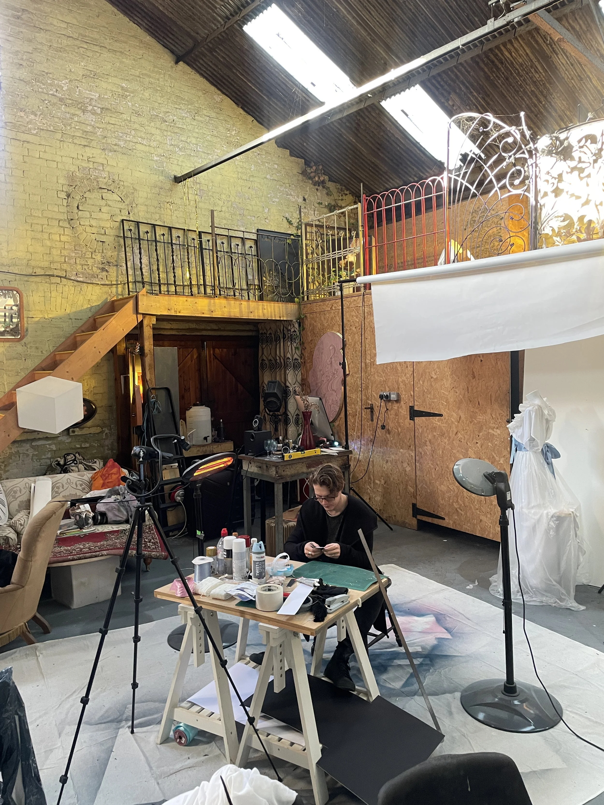 here is a view of the studio, today January 19th. There is a wonderful moment in the afternoon when the light from the window hits some gold tassels on the mezzanine and projects beautiful ripples across where the canvases will hang while i work on the collection.